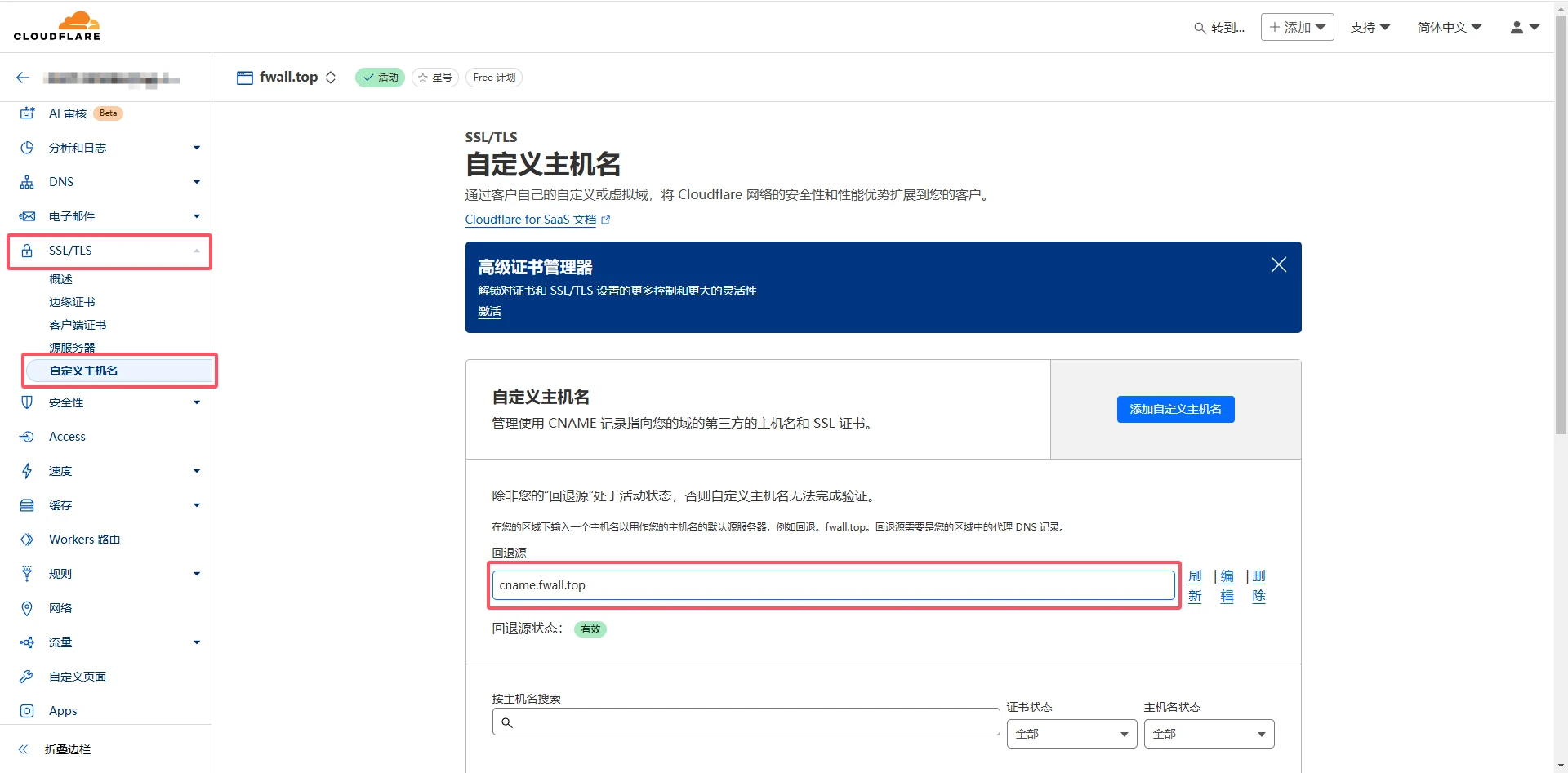 在左侧导航栏点击“SSL/TLS”二级菜单下的“自定义主机名”,将上一步添加CDN代理解析的辅助域名填入“回退源”内并保存,看到“回退源状态”显示“有效”就完成了回退源的设置。