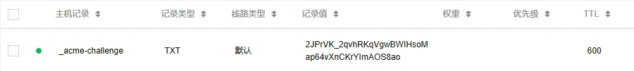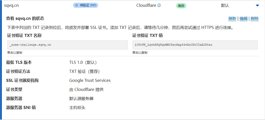 然后再根据Cloudflare的提示添加TXT记录,使“证书状态”生效(TXT记录生效这过程可能要等待十几分钟或以上),这样主域名就配置好了CDN的同时还带上了自动续期的SSL加密证书。