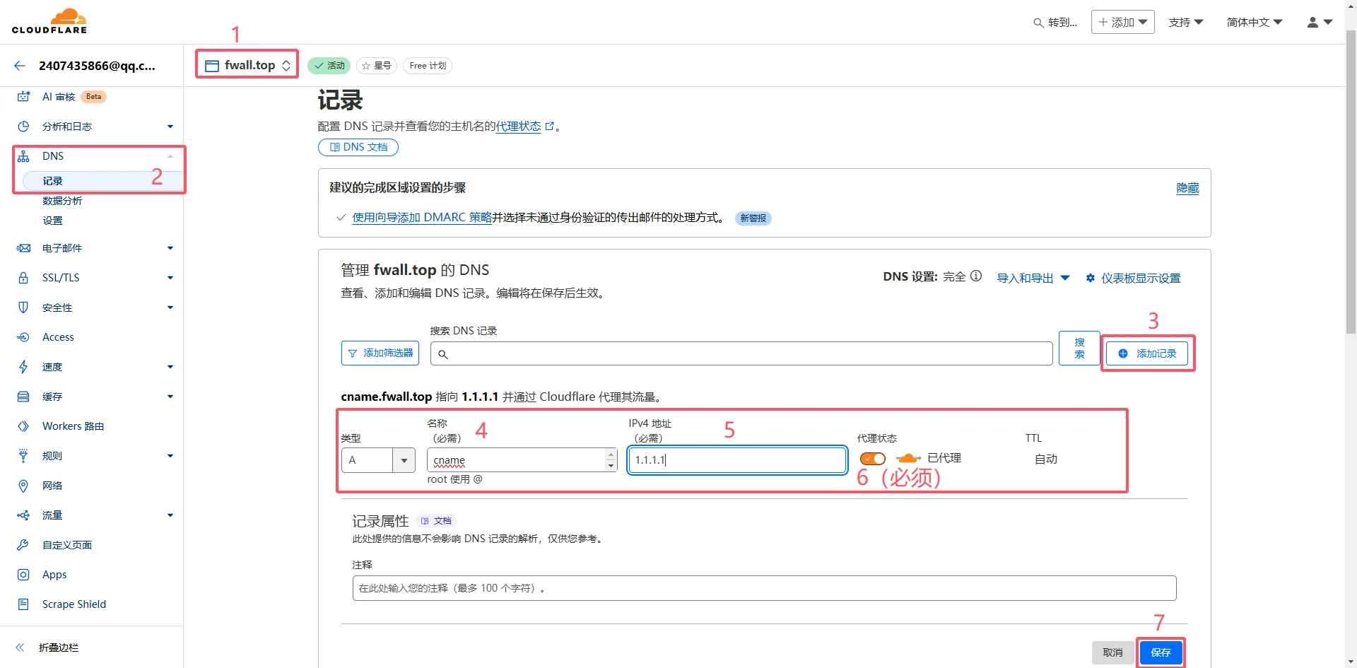 点击辅助域名进入域名的详细页,在左边导航栏选择 DNS-记录,点击“添加记录”,“类型”默认A记录就行了,不用改,“名称”输入框填“cname”,“IPv4”输入框填你的源服务器IP地址,“代理状态”默认是开启的,不能关闭,然后点击“保存”按钮完成辅助域名的CDN代理服务。