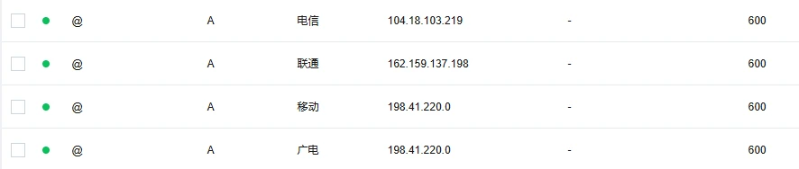 其中辅助域名的IP是Cloudflare自动分配的,我们主域名cname解析辅助域名的时候也会继承辅助域名解析的IP(即Cloudflare自动分配的IP),这时只需要我们通过添加各大运营商的A记录解析到我们自己选择的Cloudflare IP就达到了自己选择优秀IP的目的,即优选IP。