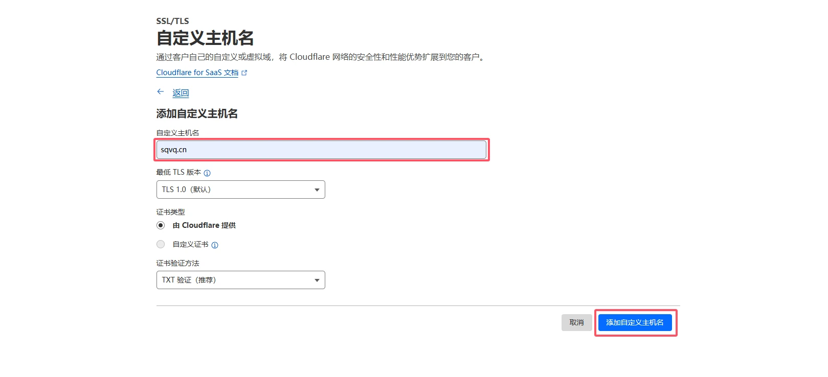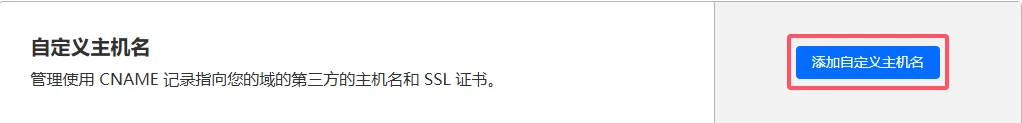 接下来就可以添加自定义主机名了,点击“添加自定义主机名”按钮,将我们的主域名填入“自定义主机名”输入框,其它保持默认就行,点击“添加自定义主机名”按钮完成添加。
