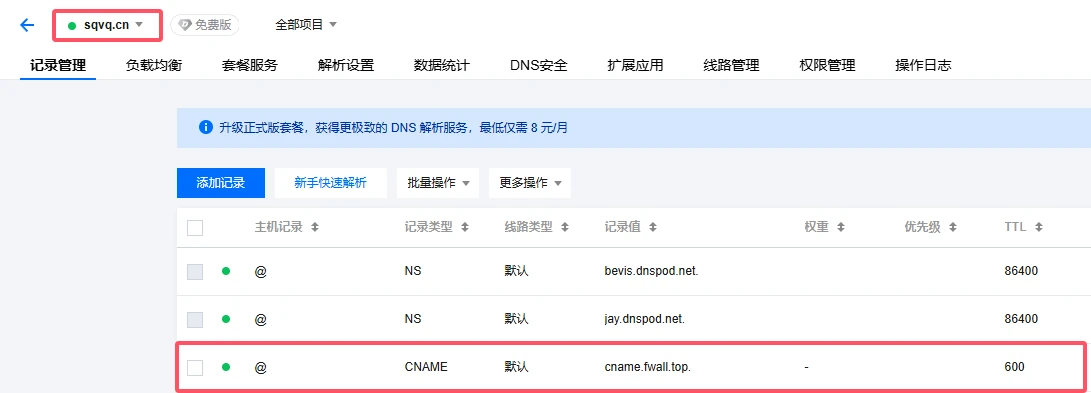 需要注意的是,在主域名设置cname解析时一定先要解析辅助域名,等待主机名生效之后再更换解析到 cloudflare.182682.xyz