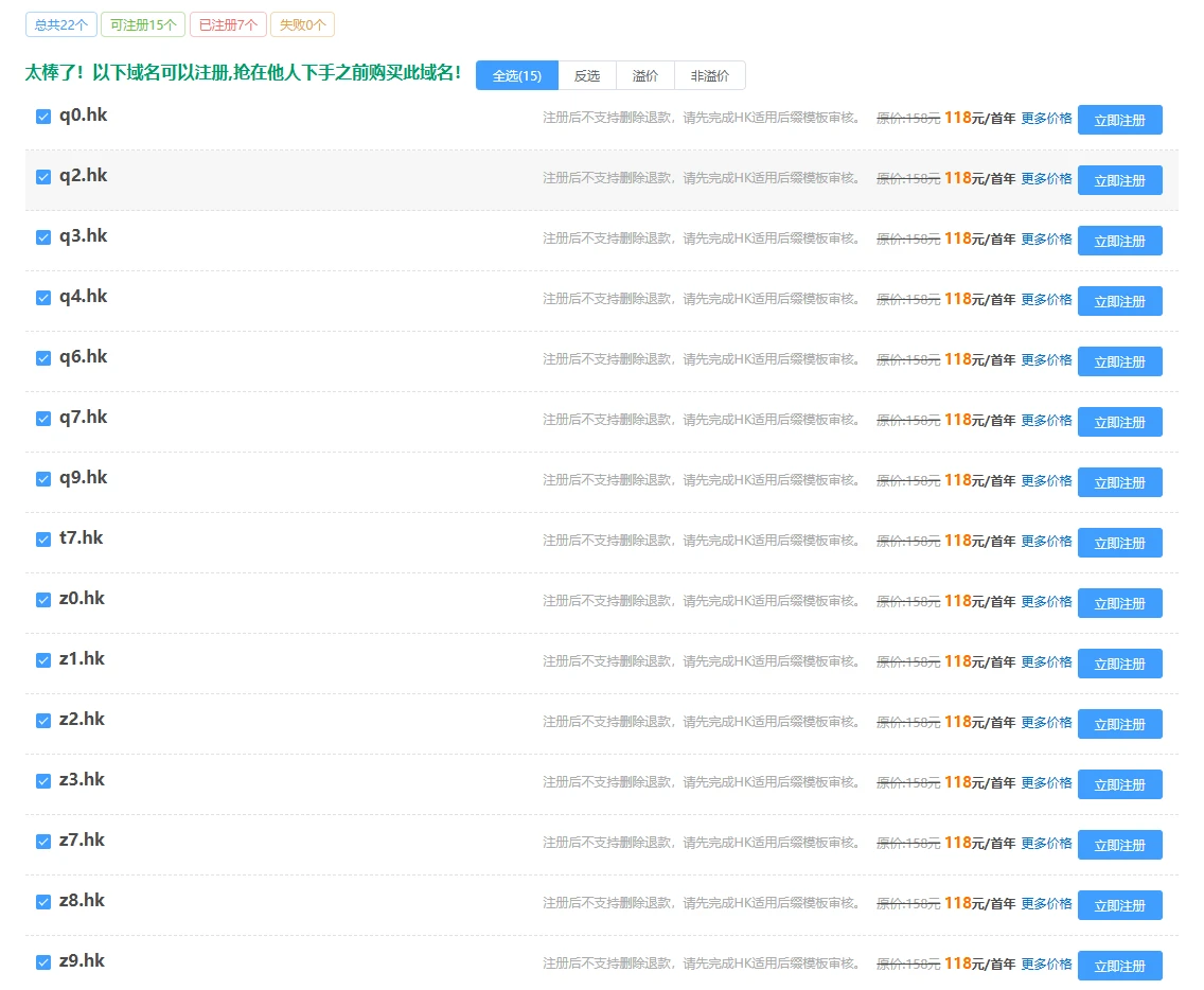 因为.hk域名比较特殊,所以除了需要中国互联网络信息中心 (CNNIC)审核实名外,还需要HKIRC香港注册机审核实名信息,且注册后无法删除退费,想要注册的小伙伴请三思后再做决定。
