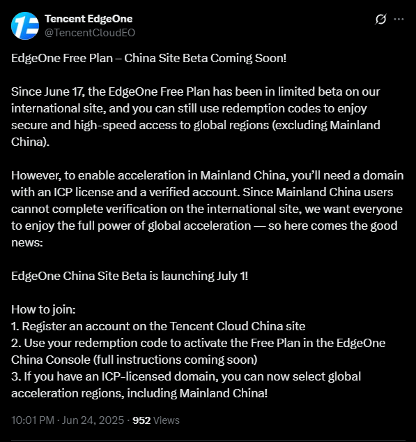 以下是腾讯EdgeOne国际发布在X平台上的原文: