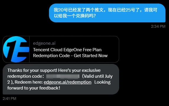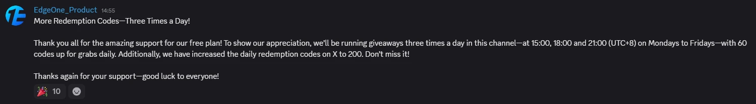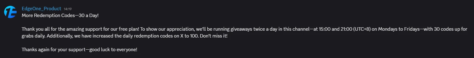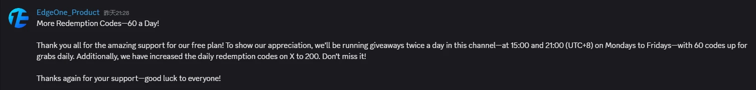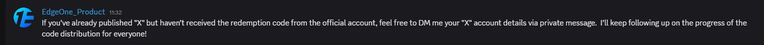 X平台获取兑换码的渠道会更加轻松,一般来说只要发了帖子的用户都可以得到兑换码,如果长时间未回复兑换码可以在Discord渠道的#giveaway频道联系EdgeOne_Product帮忙跟进。