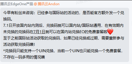 当前在国际版获取的兑换码可以直接在2025年7月1日在国内版EdgeOne官网直接兑换。