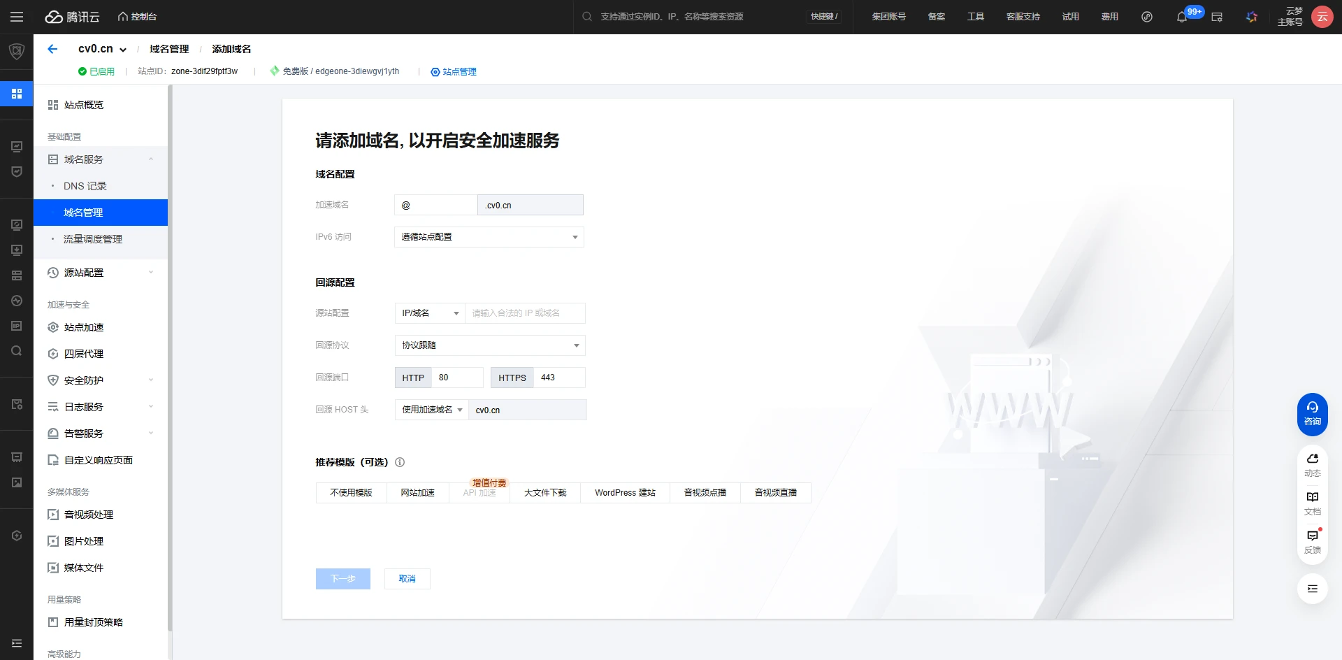 添加站点的流程和国际版类似,输入你的主域名后点击“开始接入”按钮,然后绑定好免费套餐,选择好接入模式和加速区域就好了。
