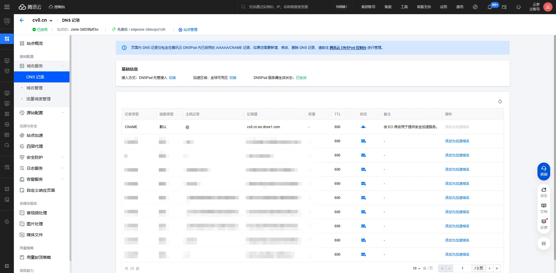 通过DNSPod 托管的方式接入的站点,相当于国际版,在“域名服务”下的二级菜单多出了一个“DNS 记录”功能选项,用户可以直接在这里看到DNS解析的记录。