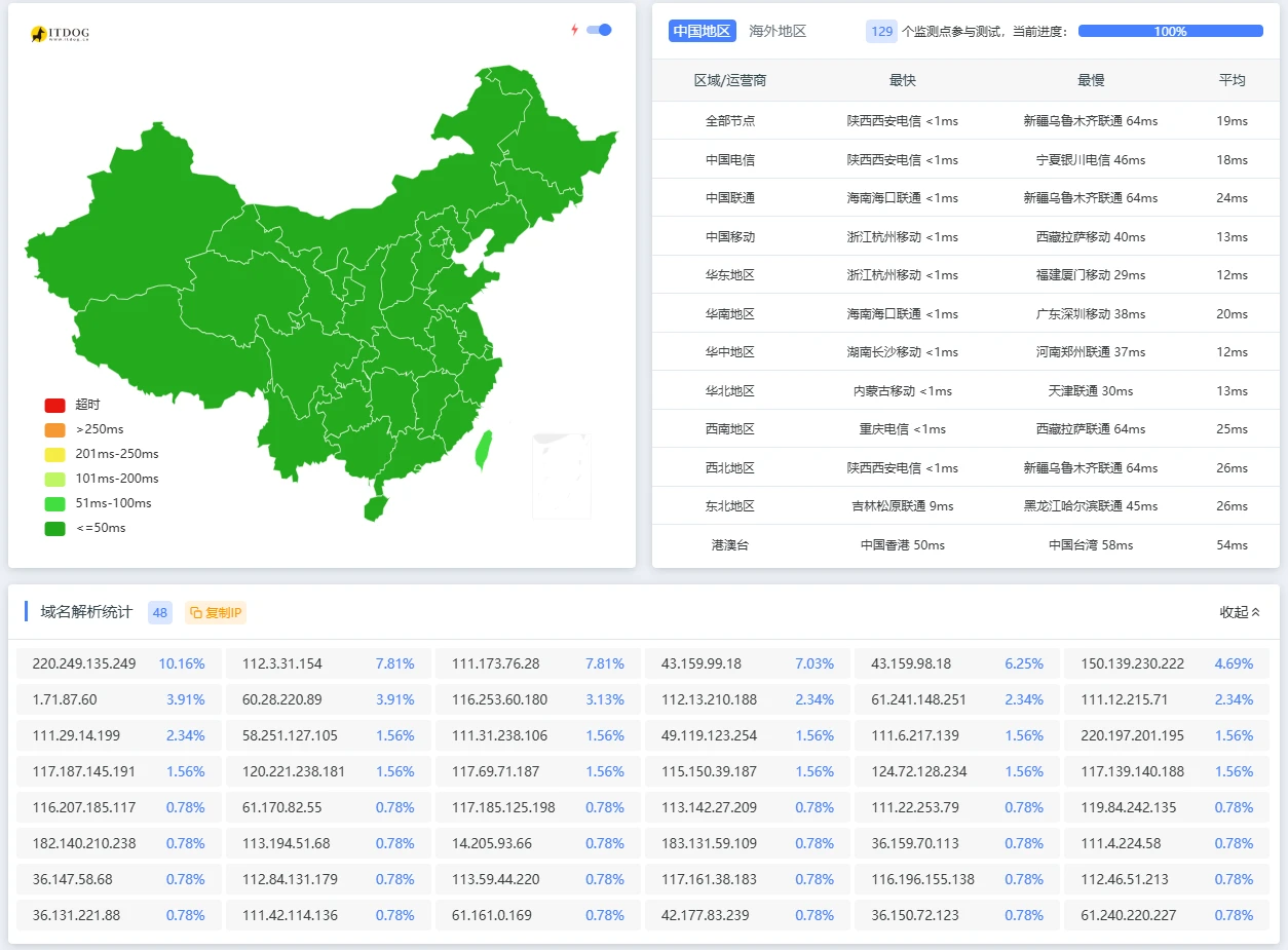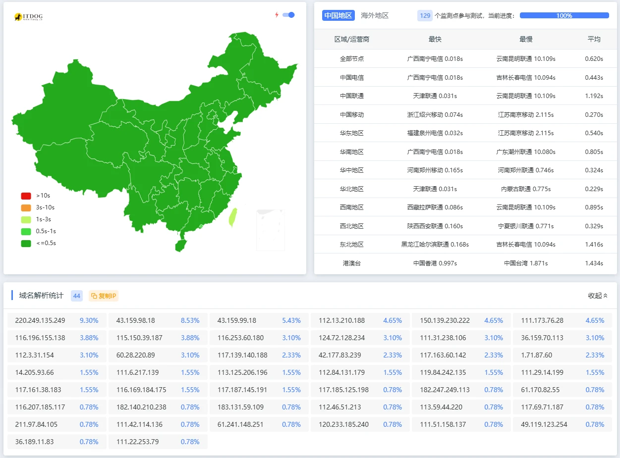 可以看到Ping和HTTP 测试的结果都是全绿,国内的节点分配到的IP节点也很多,大概全国所有地区都有节点。