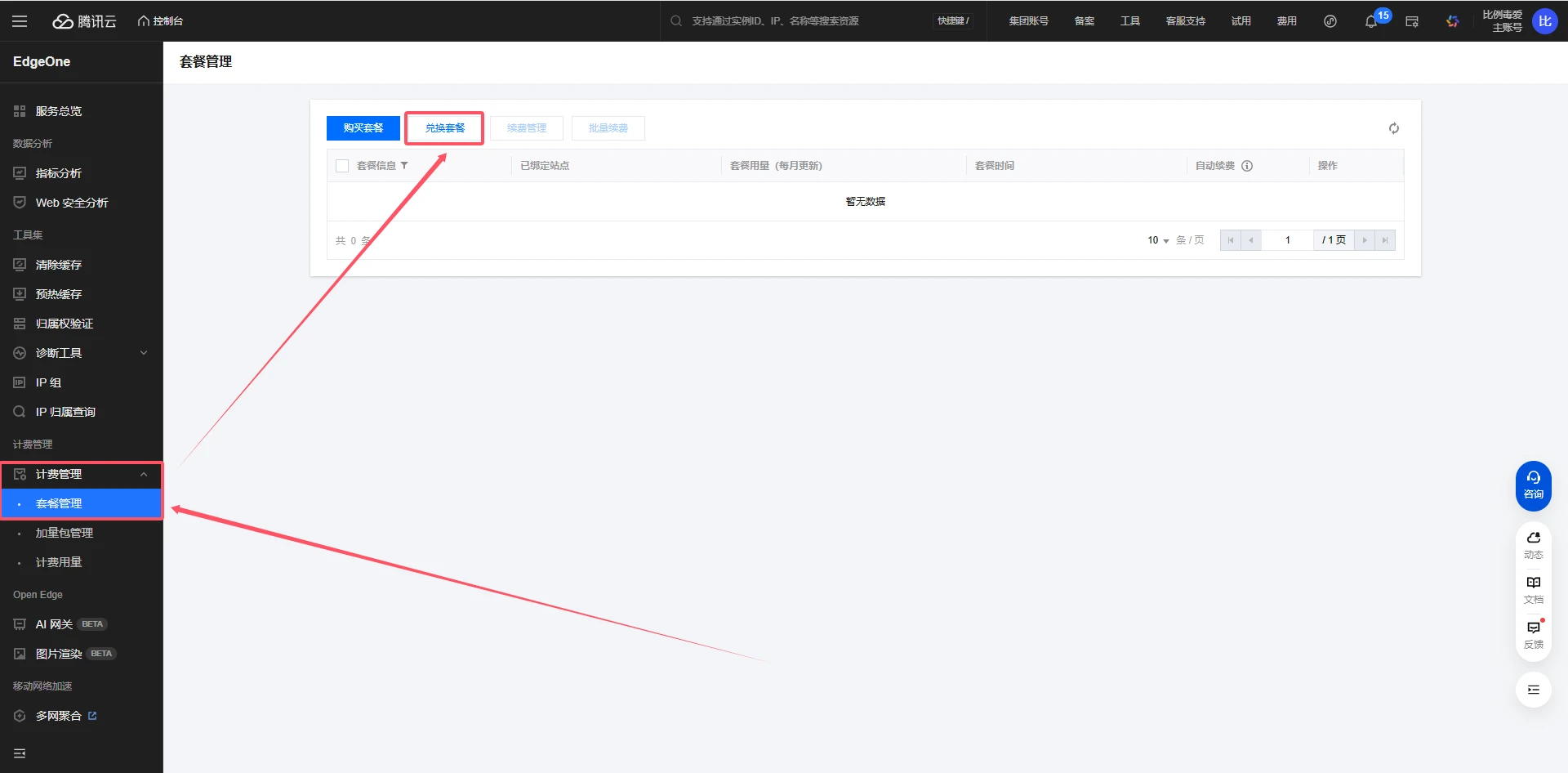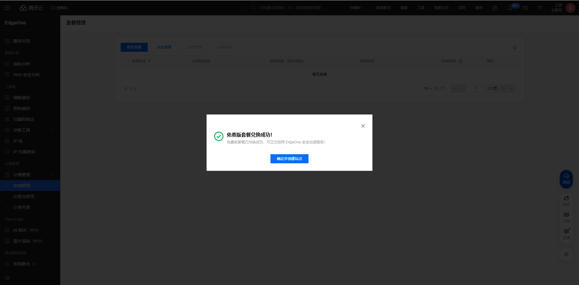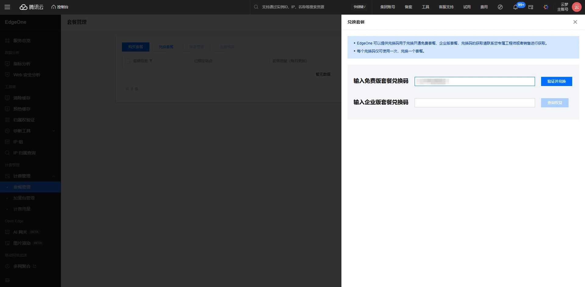 当你拥有了一个专属的免费兑换码之后,你就可以通过登录国内版的EdgeOne控制台内的“套餐管理”板块进行兑换了。